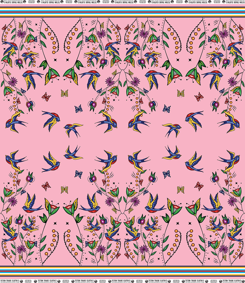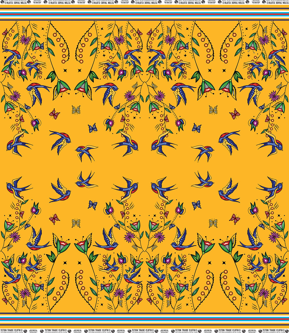 100% cotton poplin. 58" wide, Teton Selvedge edge design, sold by the yard. Designed exclusively for Teton Trade Cloth by Designed by Nicole Bandit Grey (Forest County Potowatomi).